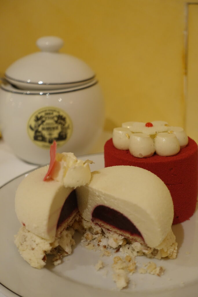 Une mousse de lait d’amande, délicatement infusée au thé vert Sakura, Sakura !, dévoile un cœur fleuri d’une infinie douceur. Elle repose sur un croquant de dragées blanches qui apporte relief et surprise. L’ensemble est aérien, pour ne pas dire frivole.