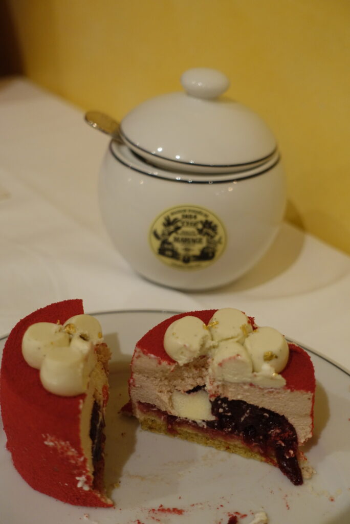 Ici, la gourmandise se fait plus intense.Un cœur profondément fruité à la pulpe de prune parfume un pain de Gênes aux amandes et à la vanille bourbon. Une chantilly infusée au thé noir Ume Cha, aux notes de pruniers en fleur, dessine des pétales immaculés sur un dessert rouge vibrant.La douceur de l’amande, la vivacité du fruit, la subtilité du thé : une composition aussi élégante qu’un kimono de printemps.