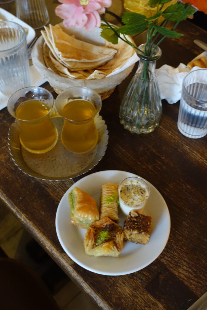 Une farandole de saveurs, de textures et de parfums qui défilent sans jamais lasser. Et parce qu’un brunch libanais ne serait pas complet sans une touche sucrée, les pâtisseries orientales viennent clore le repas, accompagnées d’un thé à la menthe brûlant et parfumé. Un moment hors du temps, idéal pour prolonger la conversation et oublier l’agitation parisienne.