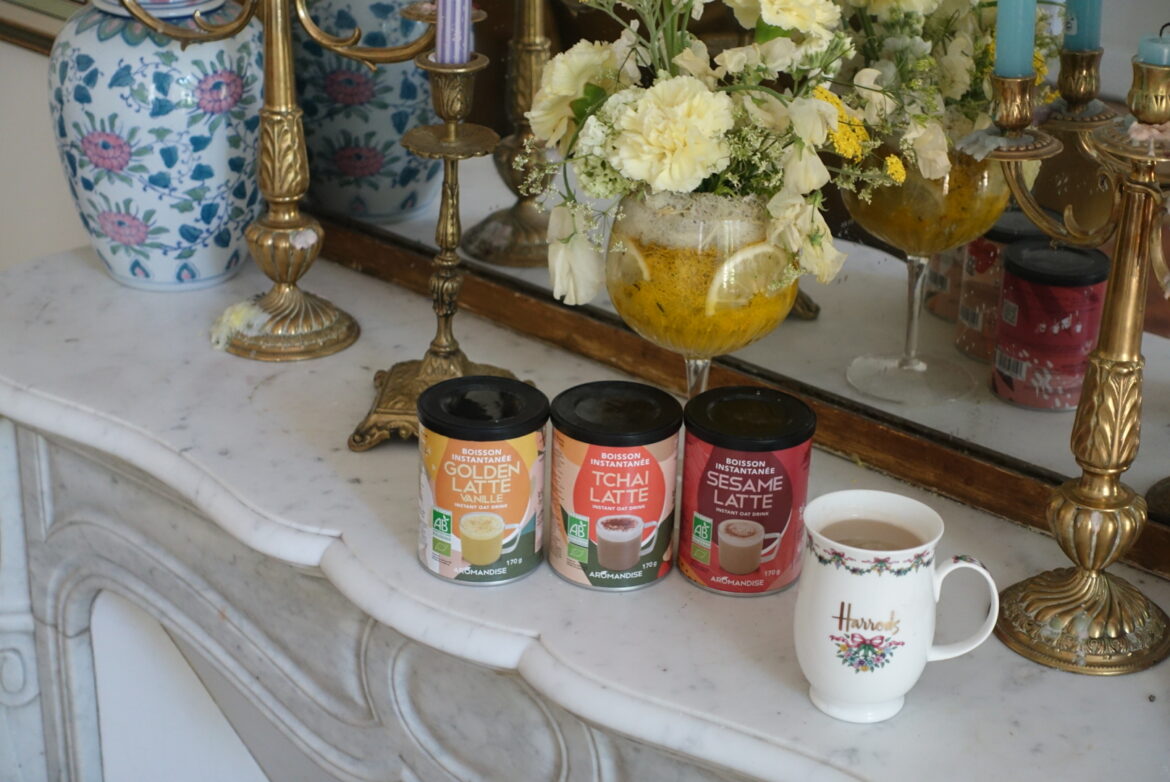 Zoom sur le Tchaï Latté bio instantané Aromandise : ce mélange unique marie la douceur de l’avoine, la richesse des épices Tchaï et les notes subtiles du thé vert Hojicha grillé, pour une expérience gustative irrésistible. Pot de 170 g – 9,90 €.
