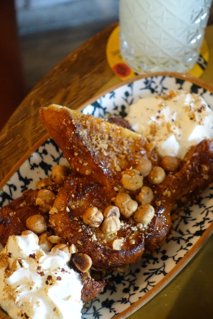 Mention spéciale pour le pain perdu aux noisettes et caramel beurre salé, servi avec une généreuse crème fouettée, à partager ou pas du tout.