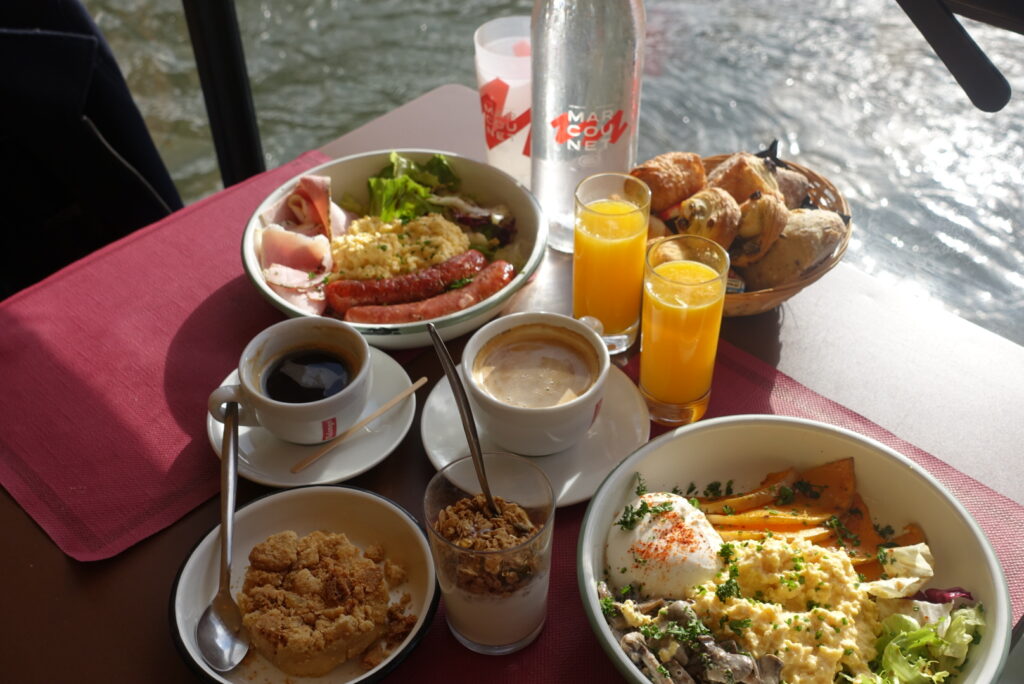 Mais ce qui rend le brunch de la Péniche Marcounet vraiment unique, c’est la musique. Jazz, swing, bossa ou chansons françaises s’invitent à bord, portés par des musiciens talentueux qui font vibrer le pont au fil de l’eau. La contrebasse résonne, la guitare dialogue avec la voix, les conversations se mêlent au clapotis de la Seine.