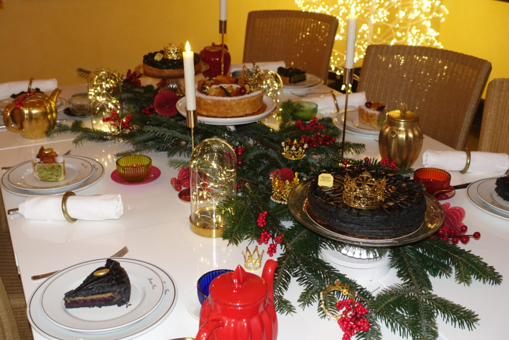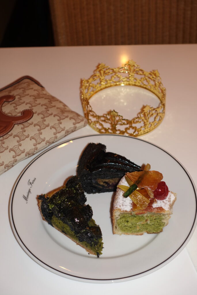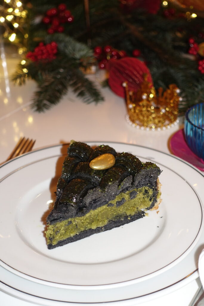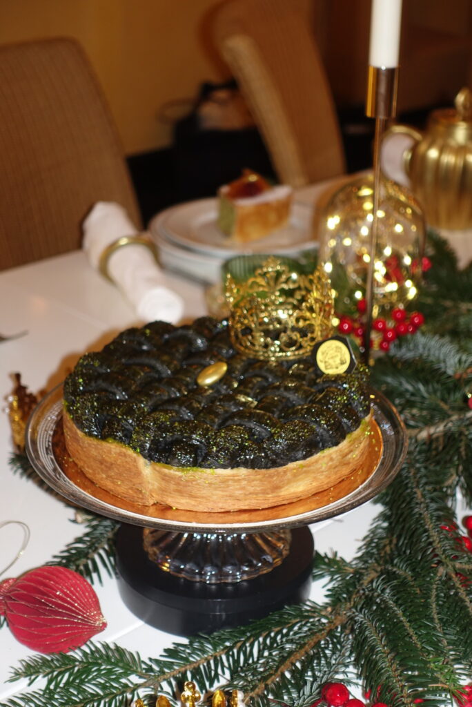 Ici, la magie opère tout en profondeur. Le mythique thé blanc Marco Polo Rhapsody parfume une frangipane soyeuse, délicatement ponctuée de myrtilles et de cassis confits, lovée sous un feuilletage noir brillant. Une dragée recouverte de feuille d’or vient illuminer l’ensemble, tel un présent précieux offert par les Rois Mages. Une galette d’une élégance rare, à la fois gourmande et poétique.
