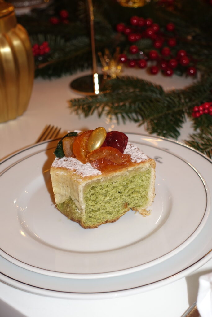 Admirée, convoitée, presque jalousée, cette couronne attire tous les regards par sa splendeur. Une brioche moelleuse, savamment parfumée au thé matcha du Japon et à la fleur d’oranger, est enrobée d’un massepain savoureux. Elle se pare de fruits confits aux couleurs éclatantes — vert émeraude, ambre orangé, rouge rubis — qui scintillent dans l’or lumineux de dragées aux amandes. Façonnée au cœur du Marais parisien, cette couronne spectaculaire se déguste comme une offrande précieuse, digne des Rois Mages.