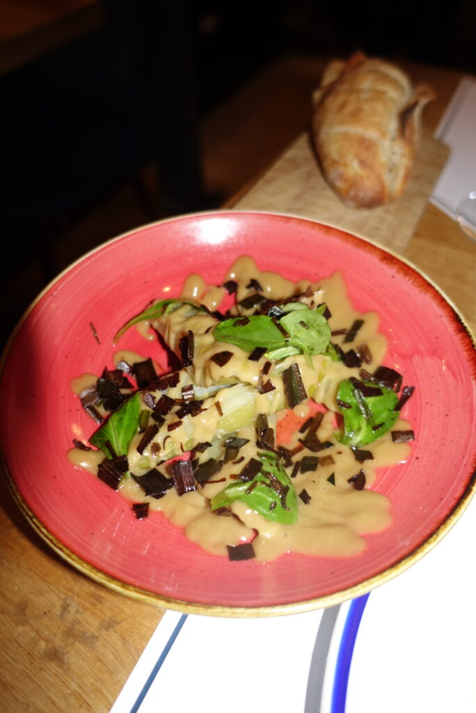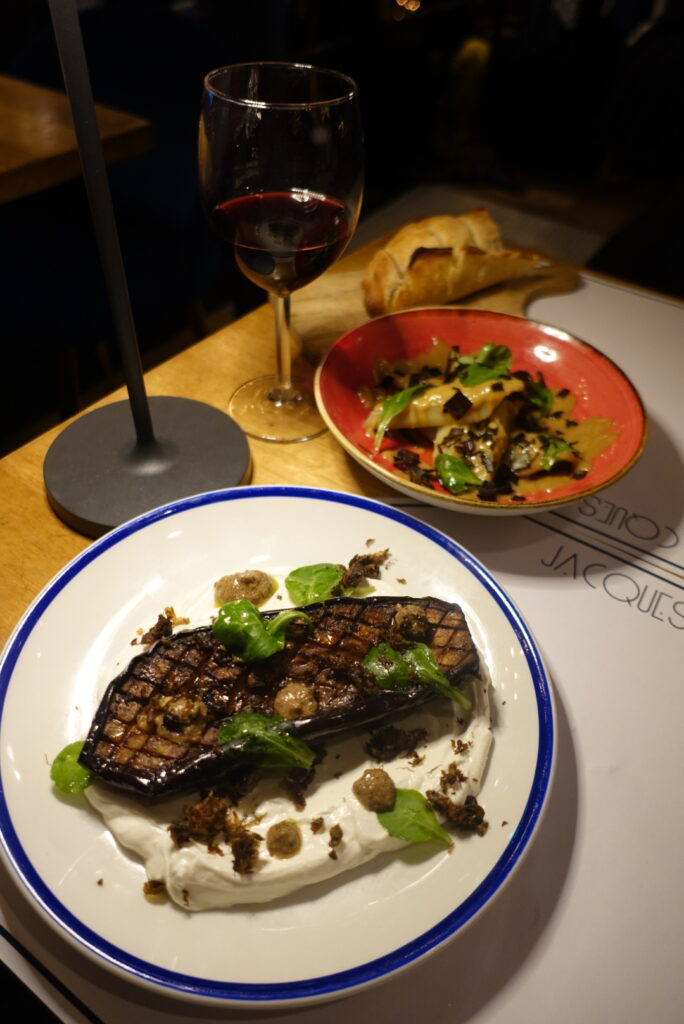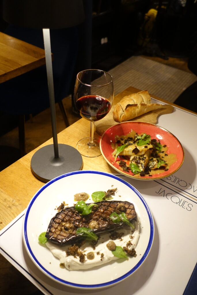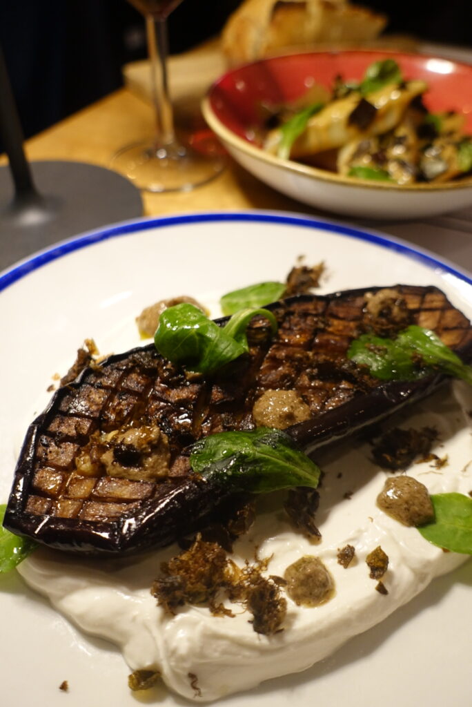 Difficile de choisir parmi les assiettes qui défilent, tant la carte séduit par sa générosité et son équilibre. Des poireaux vinaigrette et leur pointe de miel d’acacia, un classique revisité tout en douceur à l’aubergine rôtie nappée d’un yaourt grec au citron et tahin, relevée d’une vinaigrette à l’olive noire pleine de caractère, chaque plat raconte une histoire de goût et de précision.