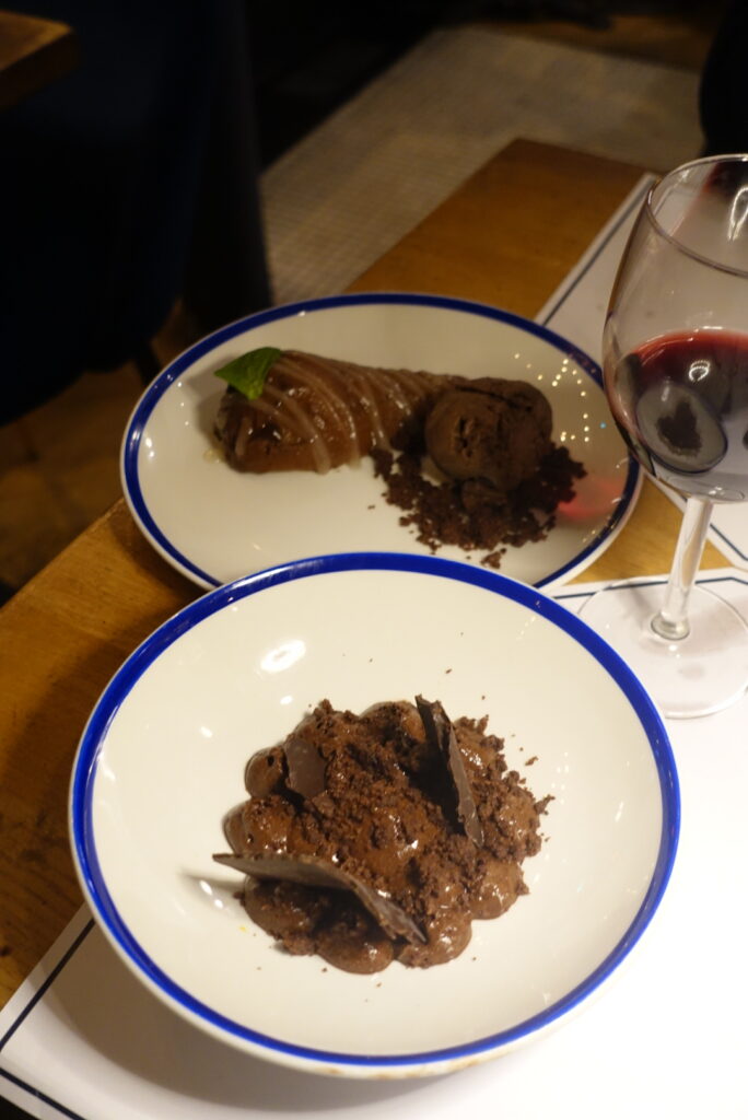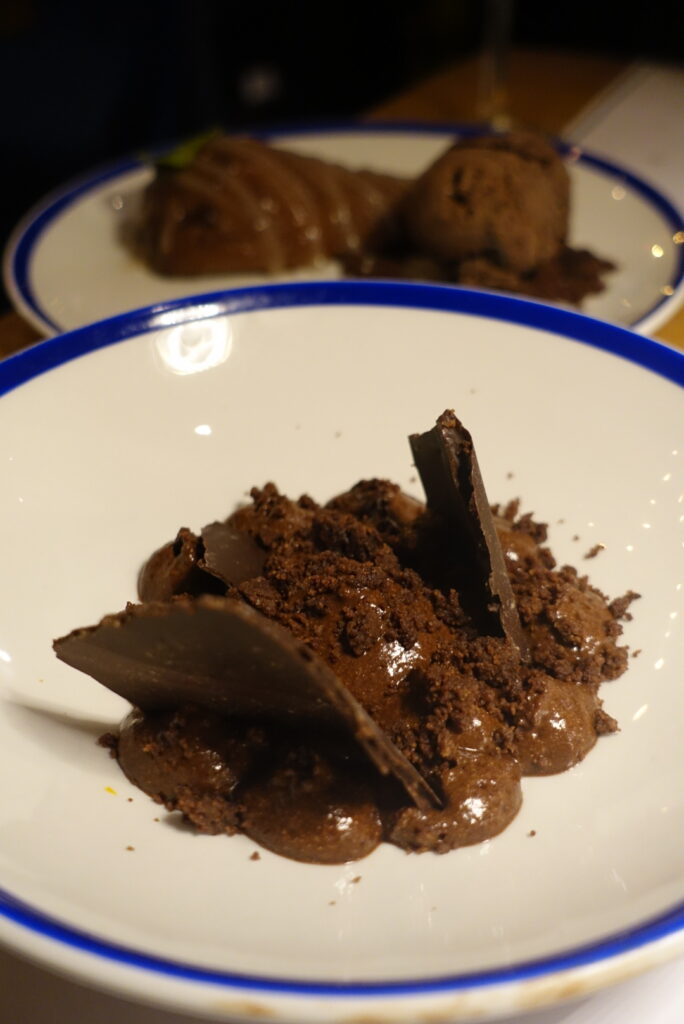 Et pour finir en beauté, la mousse au chocolat noir, dense et aérienne à la fois, se pare d’un crumble de cacao à la fleur de sel, tandis que le dessert du jour, une poire pochée, clôt le repas sur une note fraîche et délicatement parfumée.