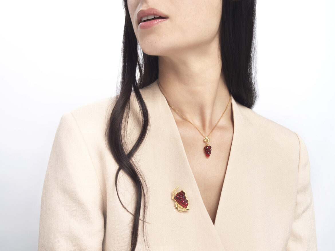 Ainsi, la grappe de raisin se décline avec volupté en pendentifs, broches, boucle d’oreilles et boutons de manchette.