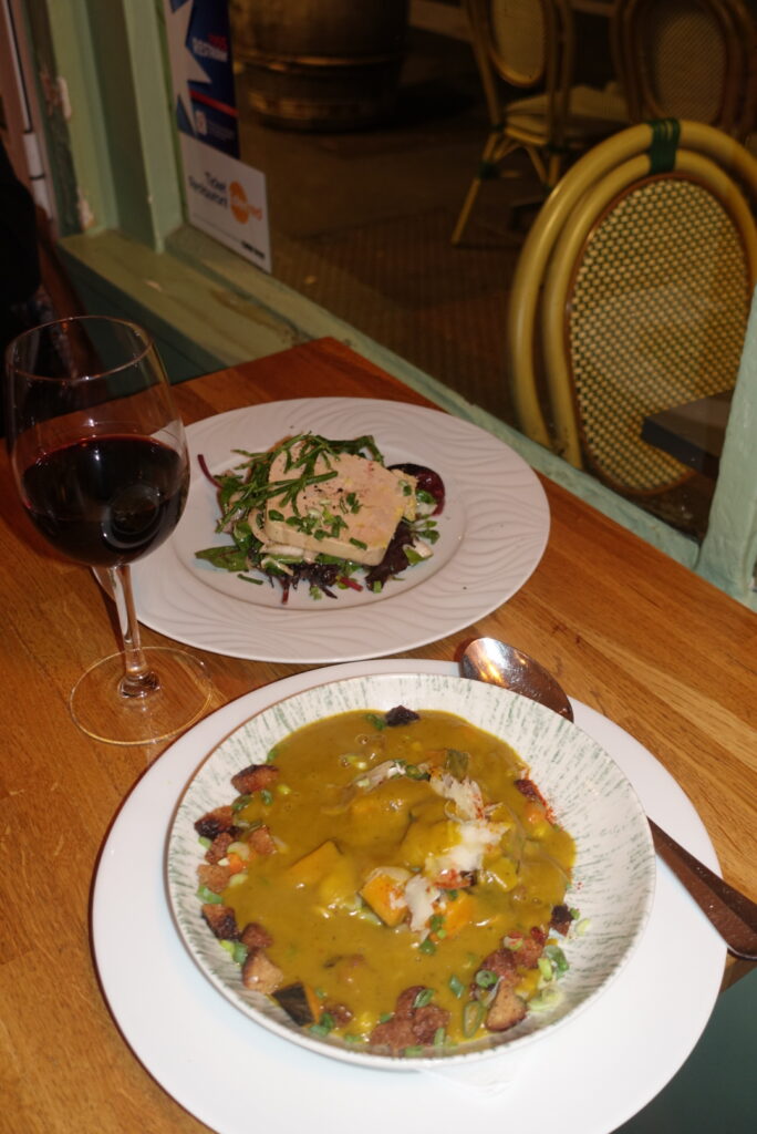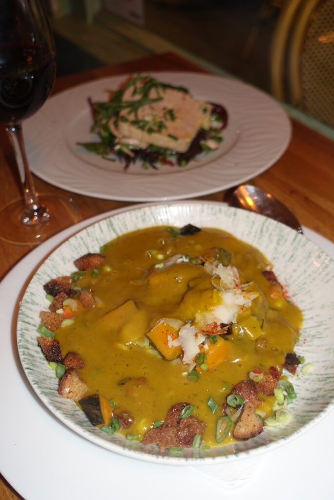 En entrée, on se régale d’un terrine de foie gras confit accompagné de sa confiture de figne, d’un velouté de Potimarron, croûtons, parmesan et potiron rôti qui réchauffe les coeurs.