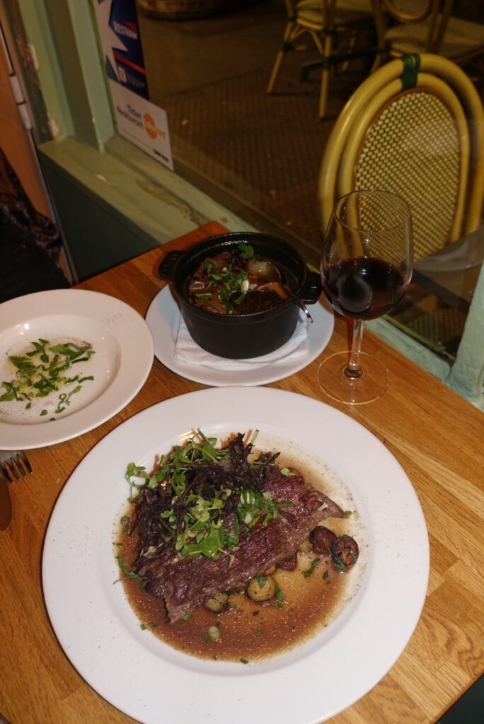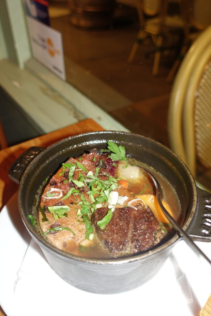 On poursuit avec une bavette Angus d’une tendreté infinie sur son lit de grenailles et de champignons de saison et on se laisse amadouer par le réconfort d’un Kig Ha Farr (pot au feu breton) avec son os à moelle et son biscuit aux raisins trempé dans le jus !