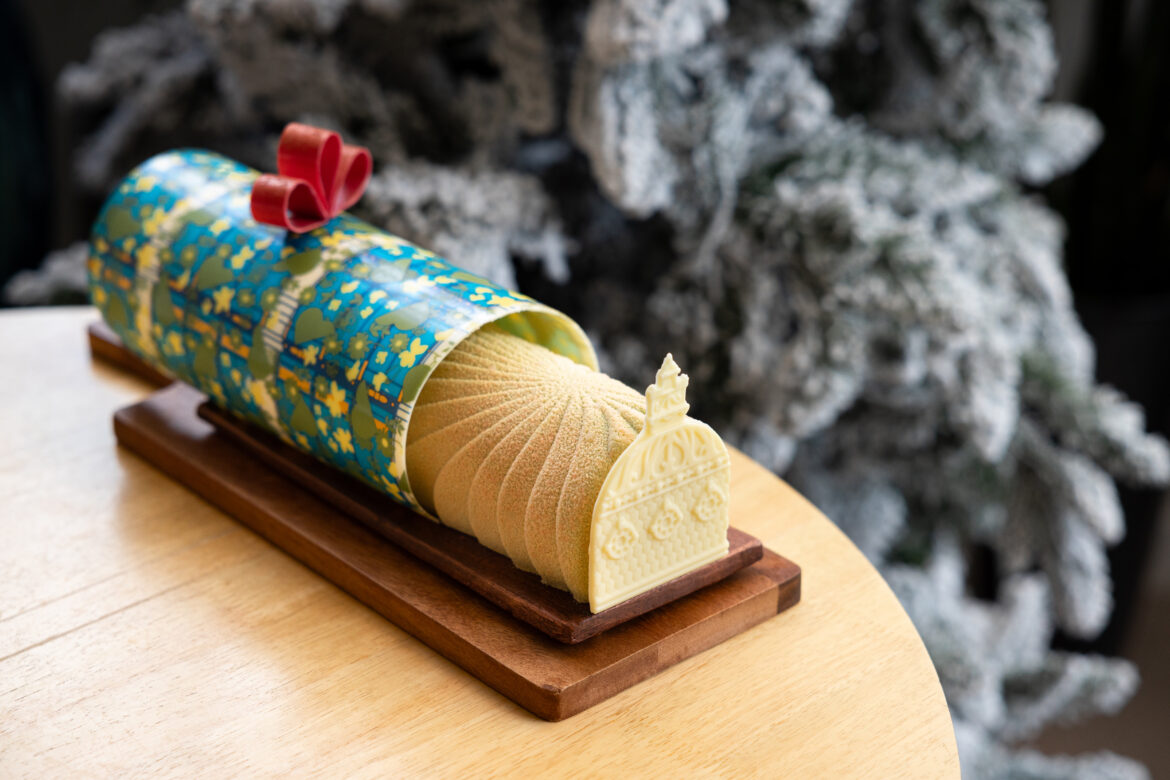 Amoureux de la Provence et fier de ses racines, le jeune prodige de la pâtisserie dévoile sa bûche “Le cadeau”. Rappelons que le thème de 2023 au Printemps est “Un Noël en papier”, c’est pour cette raison que la bûche est enveloppée d’une feuille de chocolat blanc ornée de motifs ornementaux de la célèbre coupole du grand magasin.