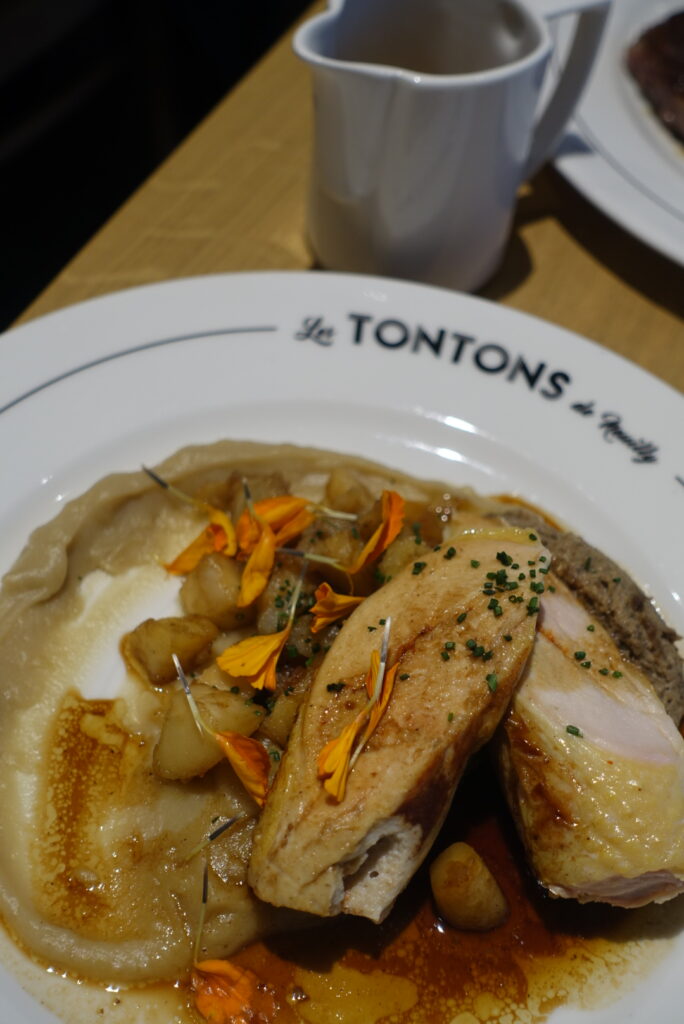 Puis vient la terrine de foie de volaille et de cochon, un hommage vibrant à la tradition charcutière française. Rehaussée d’un cognac qui apporte chaleur et profondeur, escortée de cornichons mordants qui réveillent le palais, elle déroule une palette de saveurs franches et droites. On y retrouve ce goût des choses bien faites, ce respect du geste, cette sincérité qui rend les plats mémorables.