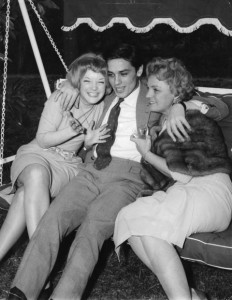** ARCHIV ** Die oesterreichische Schauspielerin Romy Schneider, links, sitzt am 22. Maerz 1959 mit ihrer Mutter Magda, rechts, und dem franzoesischen Schauspieler Alain Delon in einer Hollywood-Schaukel in Morcote bei Lugano, Schweiz. Romy Schneider starb vor 25 Jahren am 29. Mai 1982. (AP Photo/Photopress) — Austrian actress Romy Schneider (maiden name: Rosemarie Magdalena Albach-Retty) sits with French actor Alain Delon and her mother German actress Magda Schneider in the garden in Morcote, near Lugano, Switzerland, March 22, 1959. (AP Photo/Photopress)