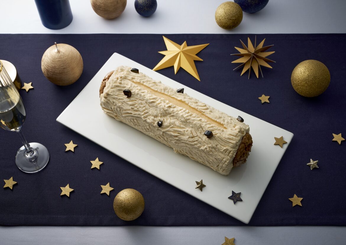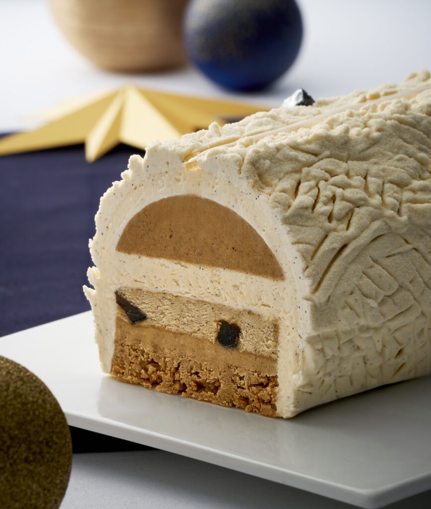 Parmi ces douceurs d’exception, la Bûche Vanille et Noix séduit par sa grâce hivernale : sous son allure épurée se révèle un subtil jeu de textures associant praliné croustillant–gianduja à la noix, biscuit soufflé aérien, mousse de vanille intensément parfumée et noix confites en touche finale, une création aussi délicate qu’un matin enneigé.