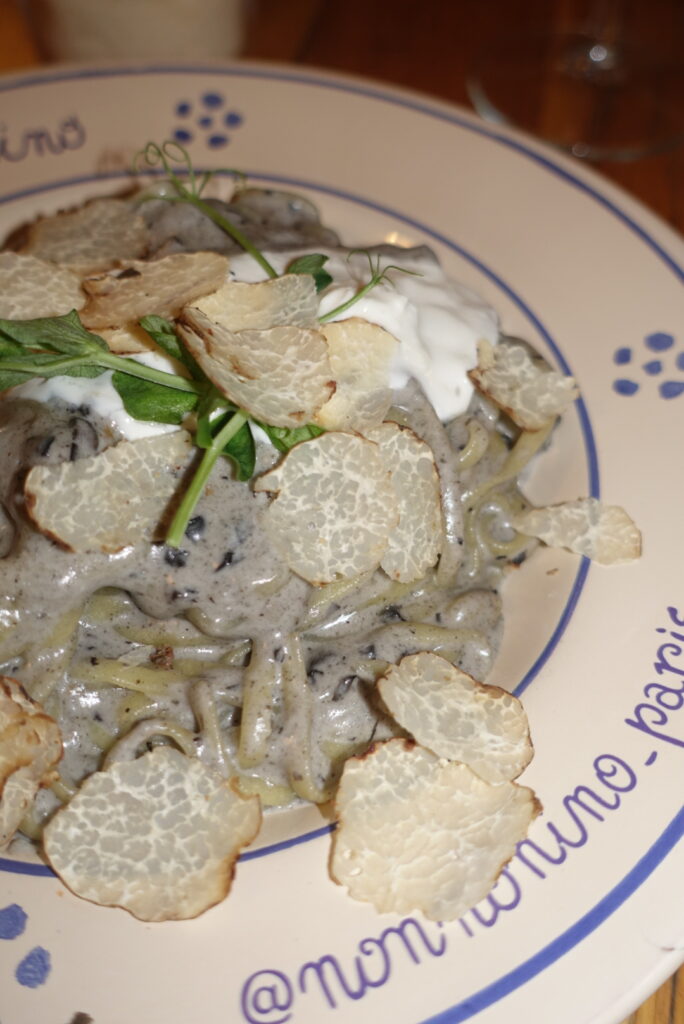 Les Tagliolini Nonno Nino sont devenus emblématiques. Fins rubans de pâtes fraîches, nappés d’une crème de truffe noire, enrichis de stracciatella, puis sublimés par une nouvelle pluie de truffe fraîche râpée à table.La texture est tout : la tension al dente des tagliolini, la générosité crémeuse, la persistance aromatique.