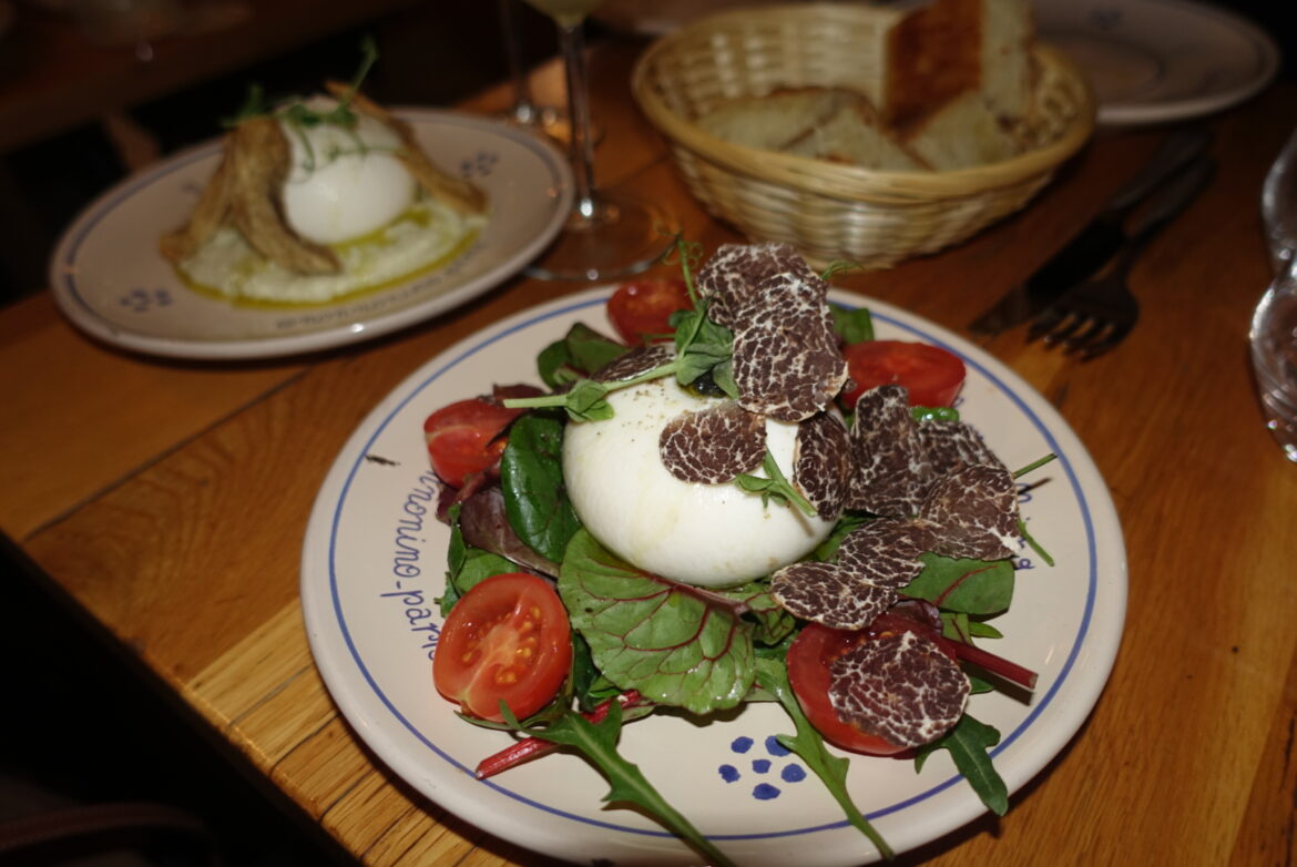 Les Tagliolini Nonno Nino sont devenus emblématiques. Fins rubans de pâtes fraîches, nappés d’une crème de truffe noire, enrichis de stracciatella, puis sublimés par une nouvelle pluie de truffe fraîche râpée à table.La texture est tout : la tension al dente des tagliolini, la générosité crémeuse, la persistance aromatique.