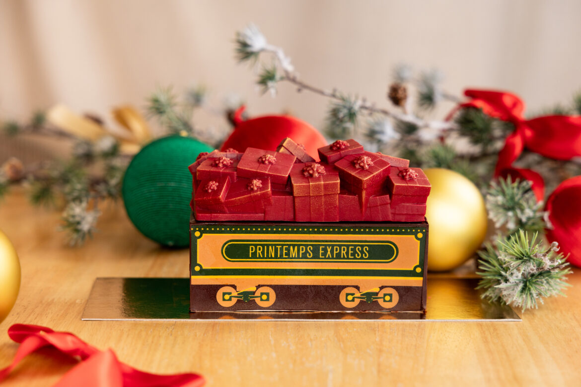 À bord de cette majestueuse locomotive, la voiture bar, la plus gourmande de toutes les rames, accueillera une création exclusive de Bryan Esposito, le chef pâtissier du Printemps. Pour Noël 2024, il signe Printemps Express, une bûche exceptionnelle et savoureuse, véritable symbole de l’art pâtissier de la maison.