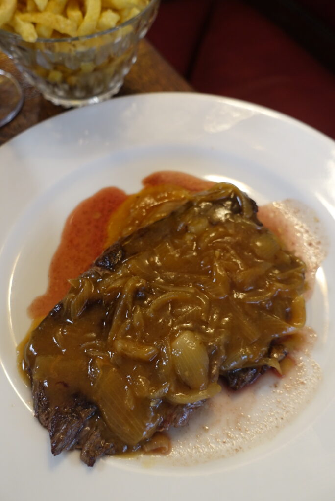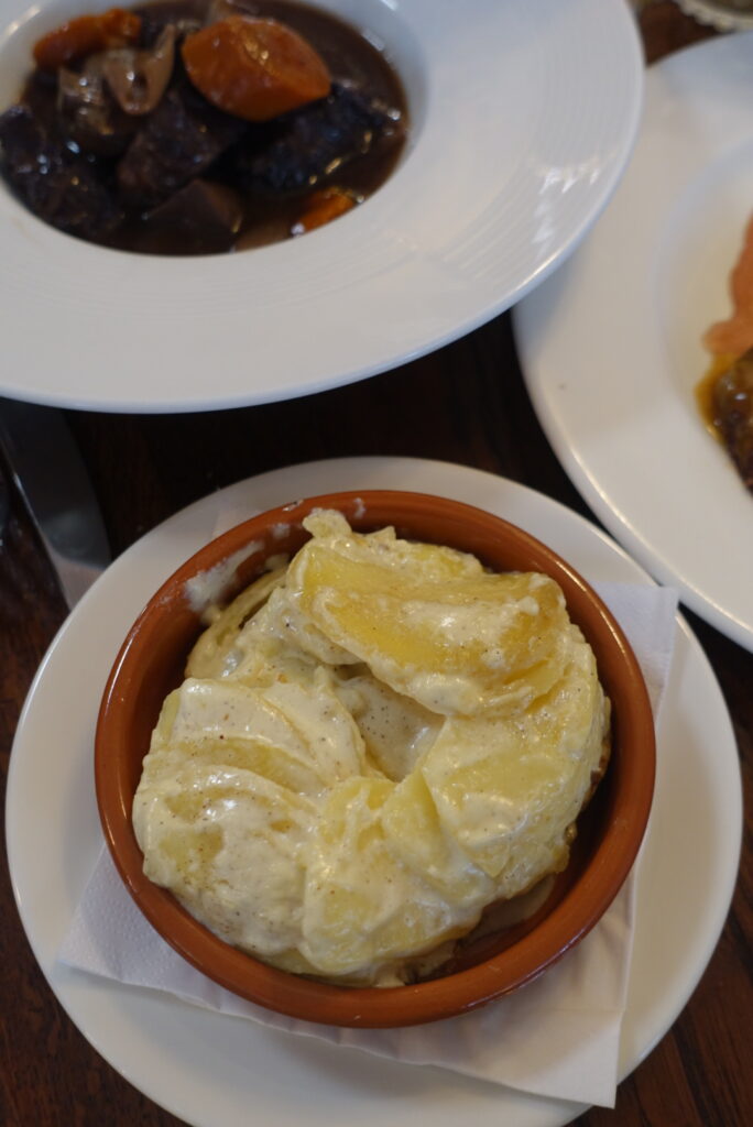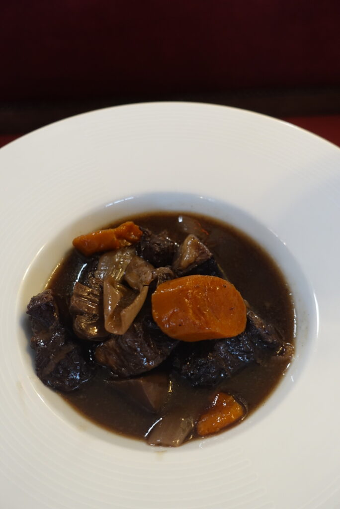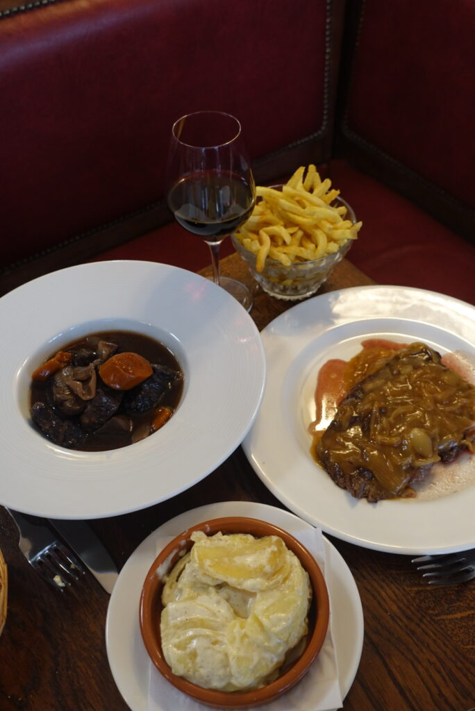 Puis vient le moment des plats, et là, coup de foudre instantané. La civet de joue de bœuf au vin de la Ferme des Arnaud, tendre à souhait, rivalise de chaleur et de profondeur avec un gratin dauphinois à la crème parfaitement calibrée. L’onglet de bœuf Black Angus, quant à lui, arrive saisi juste ce qu’il faut, nappé d’échalotes, accompagné de frites fraîches croustillantes. Le genre de duo qui vous réconcilie avec l’hiver, le monde.
